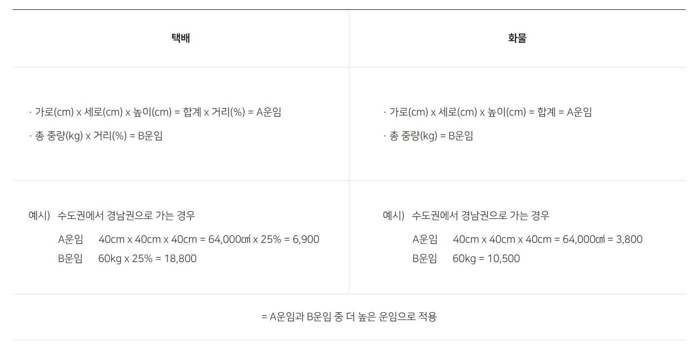 A요금은 보내는 택배나 화물의 부피와 거리로 계산을 하는 방식이고, B요금은 무게와 거리로 계산을 합니다.