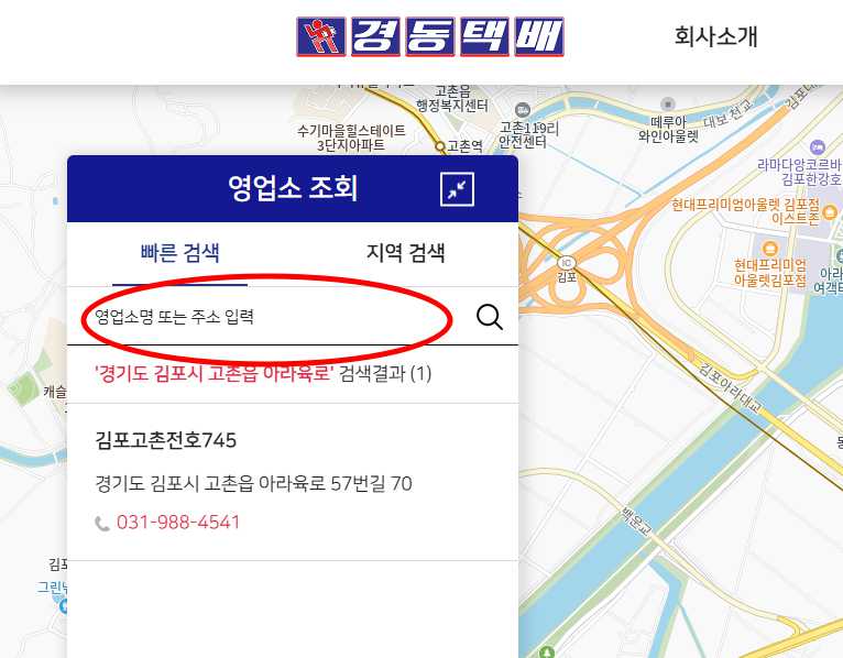 그리고 경동택배를 보내기 위해서는 먼저 내가 있는 지역의 가까운 영업소부터 조회를 해봐야 합니다. 따로 인터넷에서 접수를 하는 기능은 제공이 되고 있지 않기 때문에 가까운 영업소를 먼저 검색해줍시다.