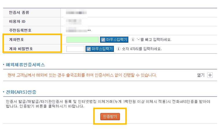 4) 계좌번호와 비밀번호를 입력하고 전화ARS인증에서 인증받기를 눌러서 전화 본인인증을 해줍니다.