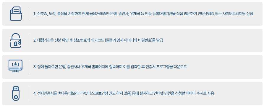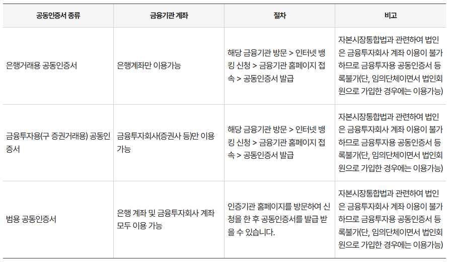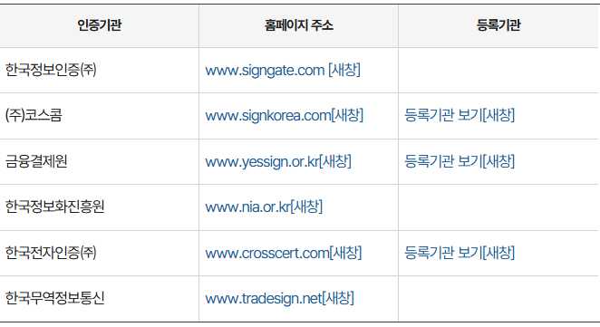 - 한국정보인증, 코스콤, 금융결제원 등의 인증기관을 통한 발급