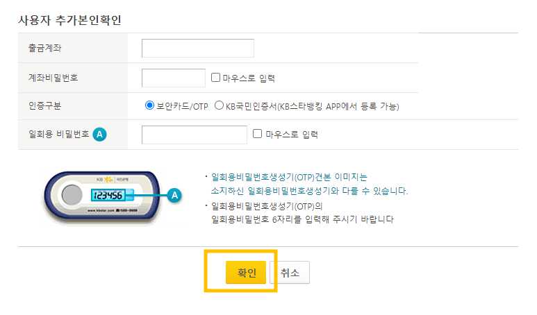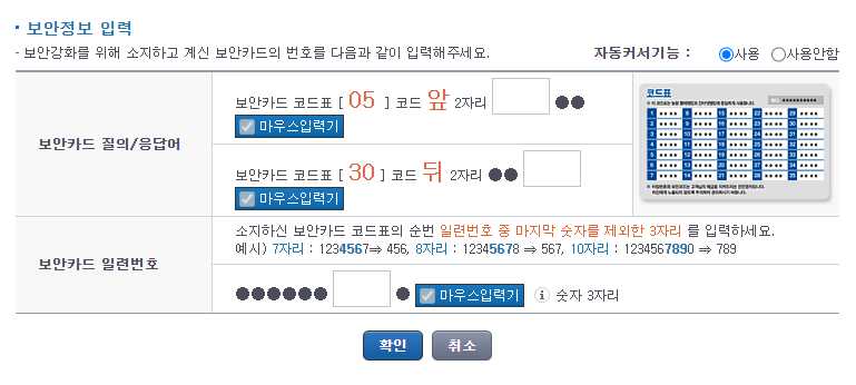 5) OTP 또는 보안카드의 숫자를 입력하고 '확인'을 눌러서 공동인증서 발급을 진행해주시면 됩니다.