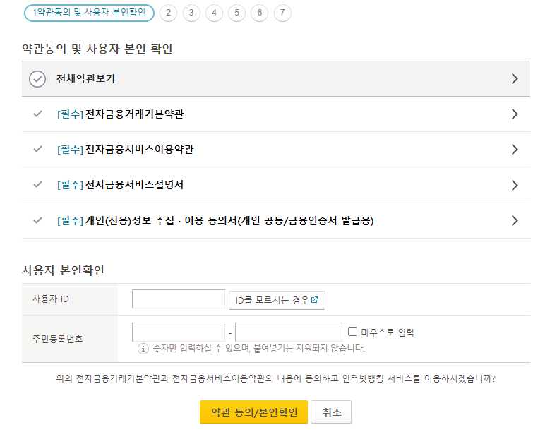 1) 약관을 확인하고 동의를 해준 뒤, 아이디와 주민번호를 입력하고 '약관동의/본인확인'을 눌러줍니다. 아이디를 모르는 경우에는 ID 입력란 우측을 눌러서 성명과, 생년월일, 출금계좌를 입력하면 바로 확인이 가능합니다.