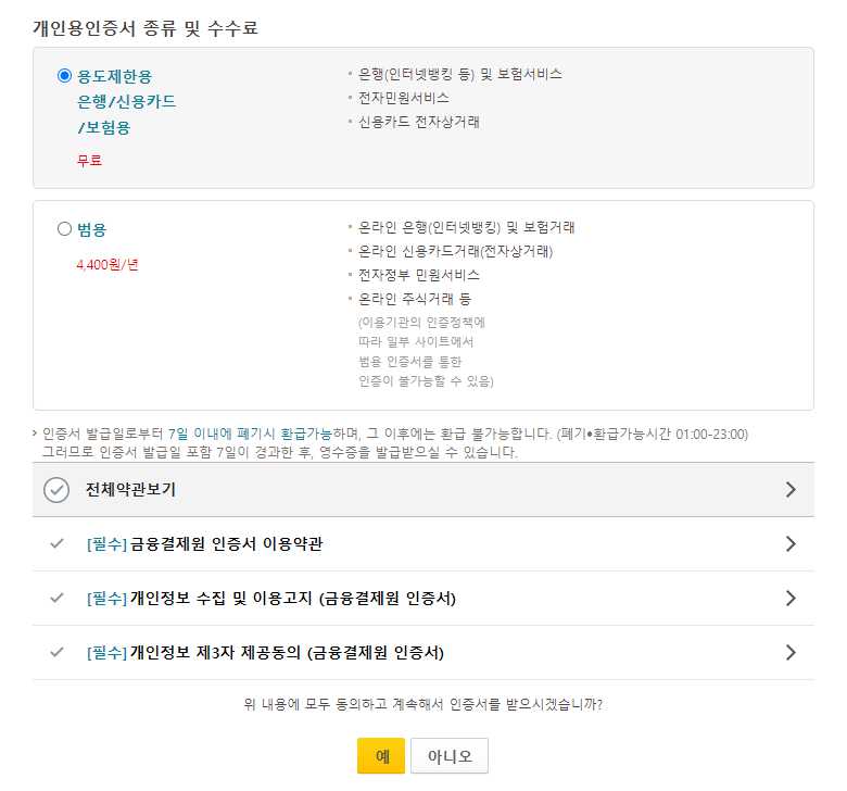 2) 다음은 인증서 종류를 선택해야하는데요, 용도제한용과 범용 중에 원하는 것을 선택해줍니다. 은행 계좌이체로만 사용을 하시려면 용도제한용을 선택하셔도 상관은 없습니다. 범용은 4,400원의 수수료가 발생을 하니 참고해서 선택을 해줍니다.