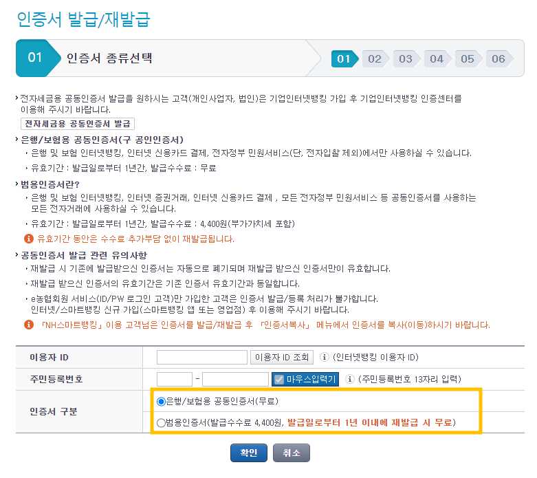 2) 인증서 발급창이 나오고 먼저 인증서 종류를 선택해줘야 하는데요, 아이디와 주민번호를 입력하고 은행용, 범용 공인인증서 중에 원하는걸 선택해줍니다. 아이디를 모르는 경우에는 '이용자 ID 조회'를 눌러서 확인합니다.