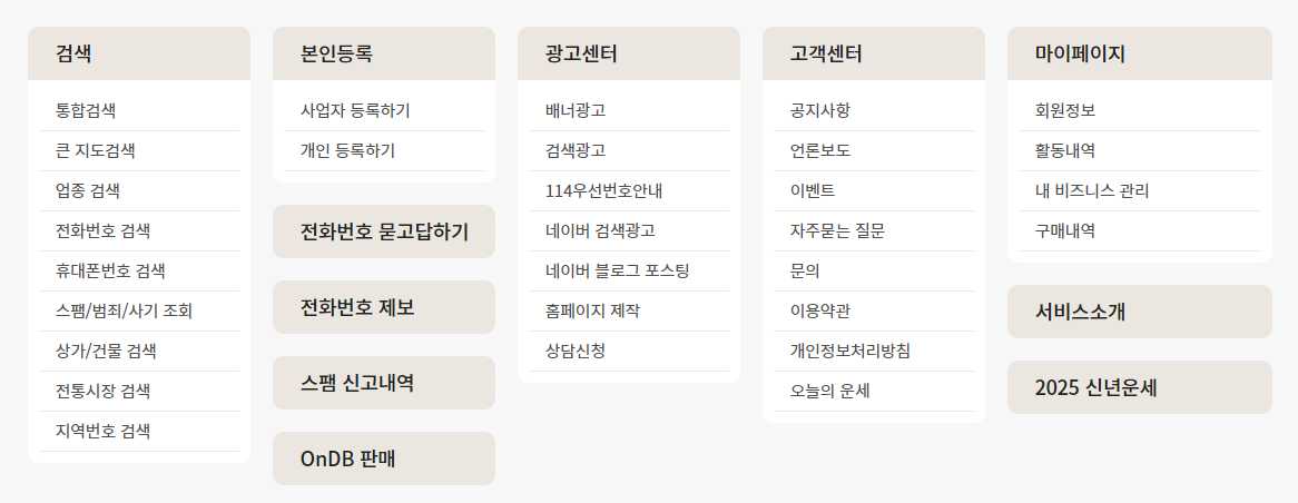 114on 홈페이지에서는 공중전화 번호 위치 찾기 뿐만 아니라, 스팸/범죄/사기 조회 및 지역번호, 전통시장, 업종검색, 휴대폰번호 검색 등의 많은 서비스를 제공하고 있습니다.