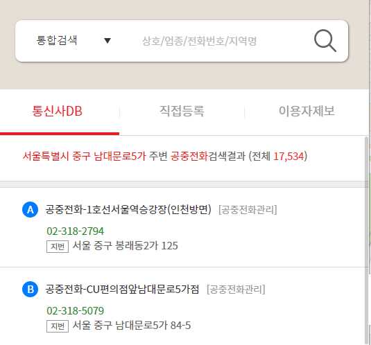 - 좌측에 있는 검색창에 공중전화번호를 입력하고 검색을 합니다.