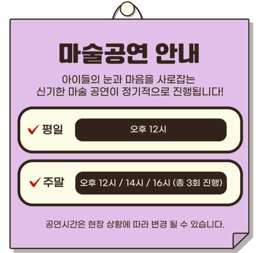 → 마술쇼는 예약 없이 현장 입장 선착순이며, 공연 시간은 입장 시 직원에게 확인하세요.
