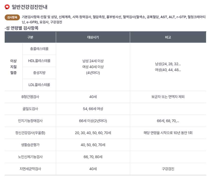 국가건강검진에 항목은 성별과 나이에 따라 다릅니다. 아래 내용에서 확인하시기 바랍니다.