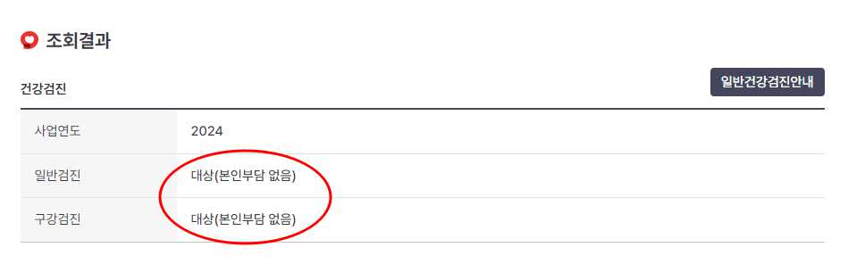 4.그러면 바로 조회결과에 일반검진과 구강검진의 대상여부가 표시되면서 대상자 조회가 완료됩니다.