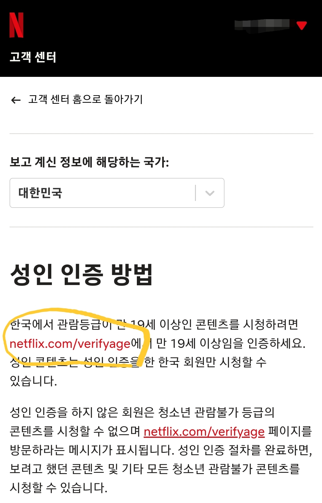 - 고객센터 성인인증 페이지에서 "netflix.com/verifyage" 라고 되어있는 부분을 눌러줍니다.