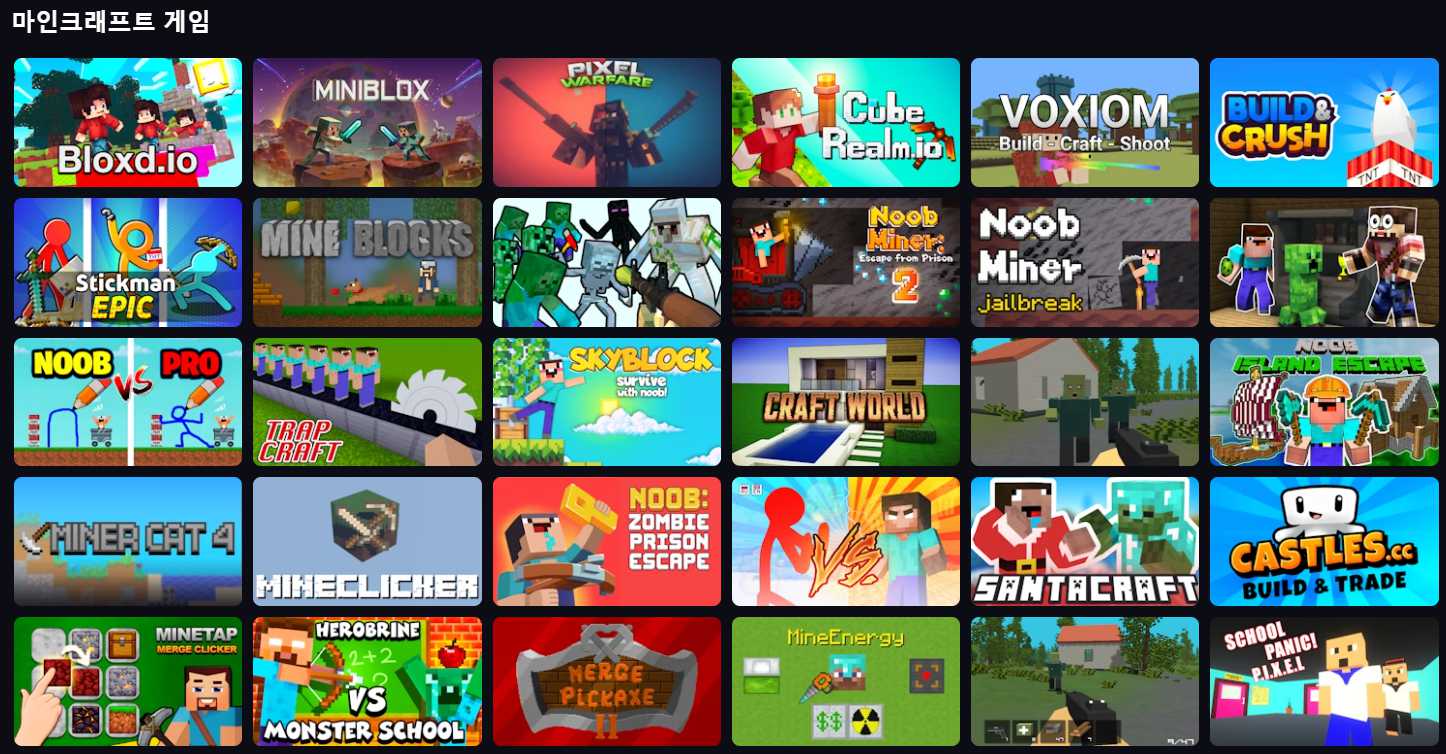 알려드린 사이트를 이용하면 어드벤처, 캐주얼, 퍼즐 등의 많은 게임을 하실 수가 있고, 마인크래프트 게임도 100여종 가까이 되는 게임들이 있습니다.