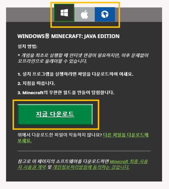 마인크래프트 홈페이지에서 Windows, Mac, Linux 운영체제에 맞게 다운을 받을 수 있습니다.