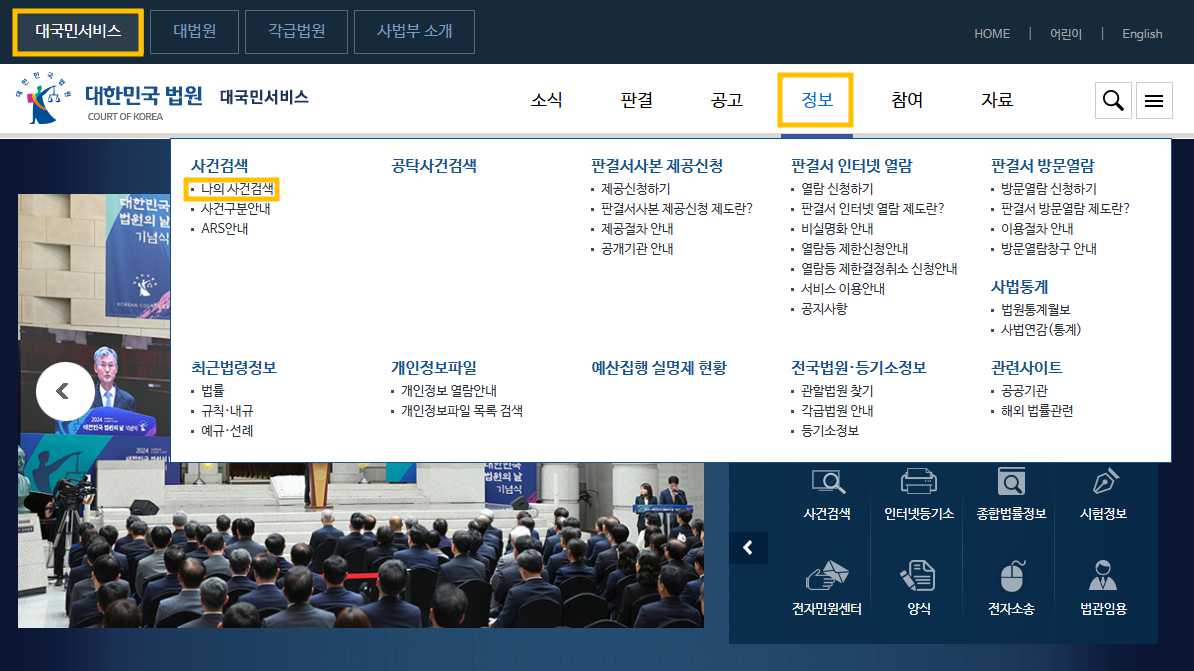 1) 대국민서비스 탭에 들어가서 '상단메뉴 > 정보 > 사건검색 > 나의사건검색'을 들어갑니다.