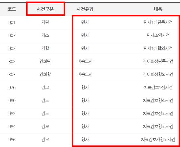 2) 사건구분 안내 페이지에서 사건구분란에 표시되어 있는 부호를 확인하고, 우측에 사건유형과 내용을 통해 형사사건인지 민사사건인지, 단독,소액,항소 등의 설명을 확인하시면 됩니다.