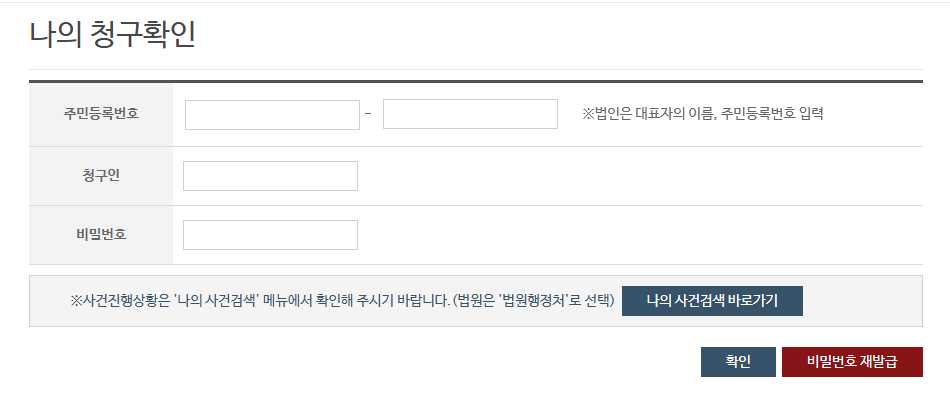 1) 나의 청구확인 페이지에서 주민번호와 이름, 비밀번호를 입력하고 사건번호를 조회할 수 있습니다.