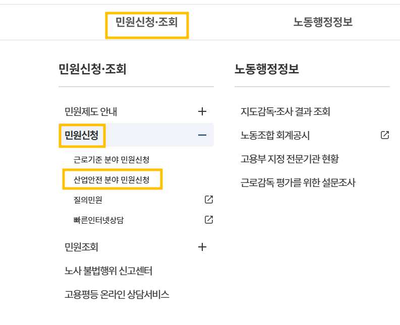 2. 상단메뉴에 있는 [민원신청 및 조회 > 민원신청 > 산업안전 분야 민원신청] 으로 들어갑니다.