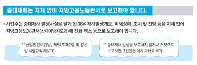 그리고 사업주는 중대재해가 발생한 사실을 알게되었다면, 어떻게 재해가 발생을 했는지 개요와 피해상황 그리고 조치 및 계획 등을 지방고용노동관서의 산재예방지도과에 보고를 해야 합니다.