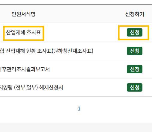 4. 아래에 검색된 내용 중에 민원서식명에 산업재해조사표라고 적혀있는 부분 우측에 신청을 누릅니다.