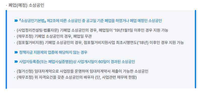 - 소상공인기본법에 따른 소상공인 중에 폐업을 이미 하였거나 폐업을 예정 중인 소상공인