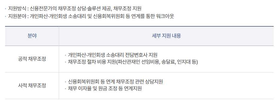 파산, 회생, 신용회복 등 채무사항 등에 관련해서 신용전문가 등을 통해 지원 받을 수 있습니다.