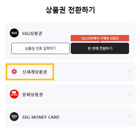 상품권 전환하기 창에서 신세계상품권을 눌러줍니다.