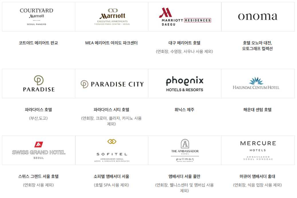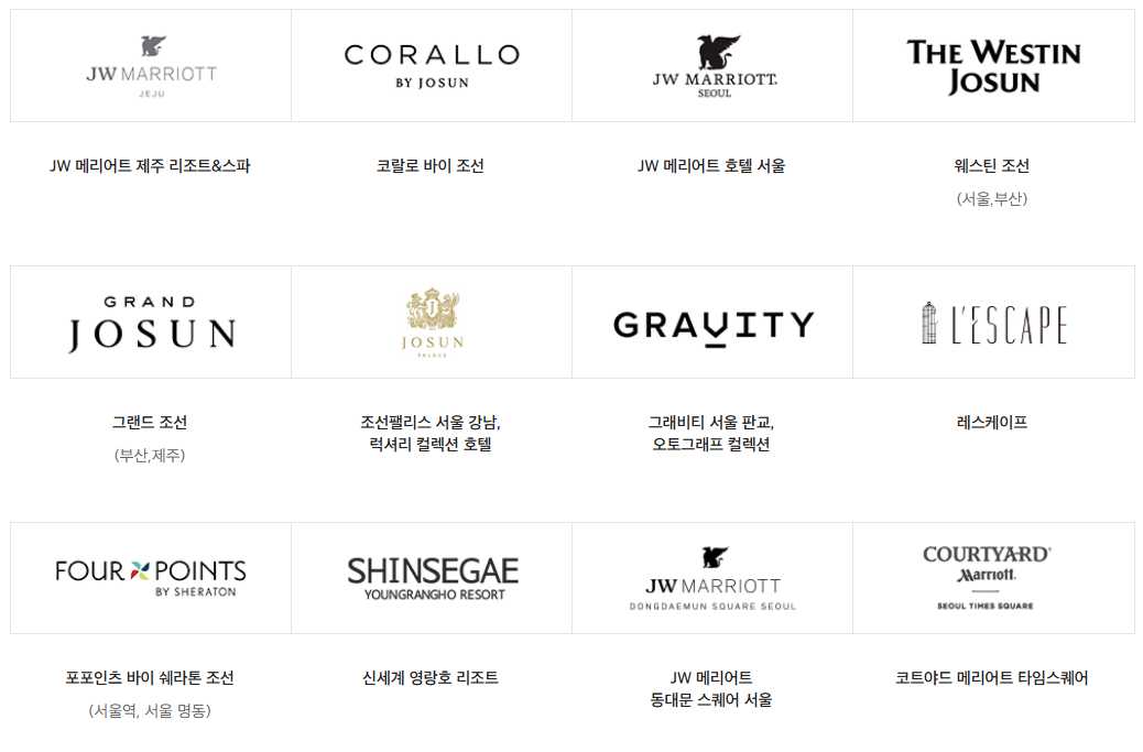 - JW 메리어트 호텔, 조선 호텔, 파라다이스 호텔 등