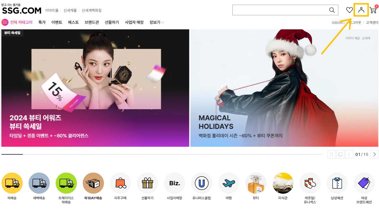 먼저, 쓱닷컴에서 로그인을 하셔야 합니다. 회원이 아니라면 가입을 해주신 뒤에 로그인을해서, 우측 상단에 사람모양의 마이페이지를 들어가줍니다.