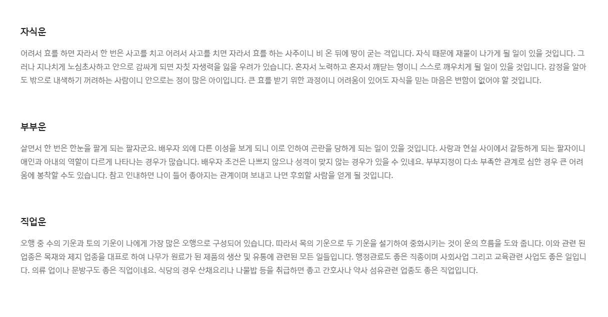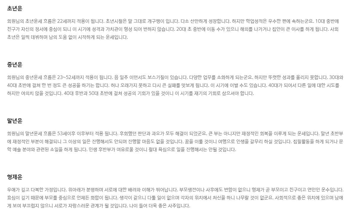 초년부터 중년, 말년 그리고 가족 및 직업 등의 운세를 확인할 수 있습니다.