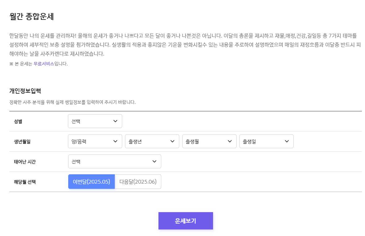 월간 종합운세는 성별과 태어난 년월일 그리고 시간까지 입력만 하면 바로 확인을 할 수가 있는데요, 시간은 사주에 큰 영향을 미치기 때문에 최대한 정확하게 입력을 해주는게 중요합니다.