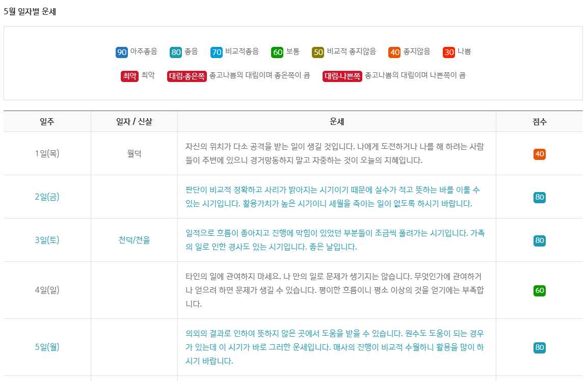 월간운세는 한달간 1일 단위로 그날그날의 운세를 알 수가 있고, 점수를 표기해서 직관적으로 알려주기도 합니다. 운세가 아주좋음부터 최악까지 나뉘어 지는데, 좋은 날은 운세를 잘 활용하셔서 중요한 일을 하시면 되고, 좋지 않은 날은 최대한 조심하시면 됩니다.