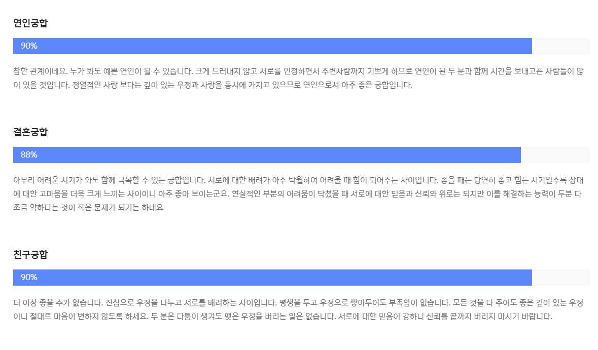 - 마음에 드는 사람이 있다면 궁합도 체크해볼 수가 있는데요, 상대방의 성격적, 성향적 이해관계를 알려주고 여러가지 잘 맞는 부분과 안맞는 부분의 궁합을 알려줍니다.