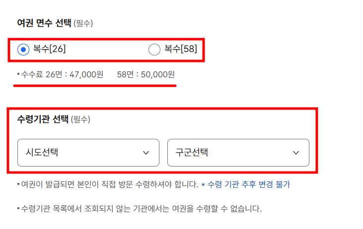 여권 면수에서 26면 또는 58면 중에 원하는 것을 선택해줍니다. 가격차이는 3,000원 차이입니다.