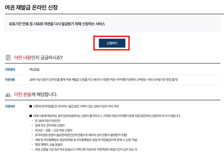 대한민국 공식 누리집 정부24에서 여권 재발급 신청이 가능합니다.