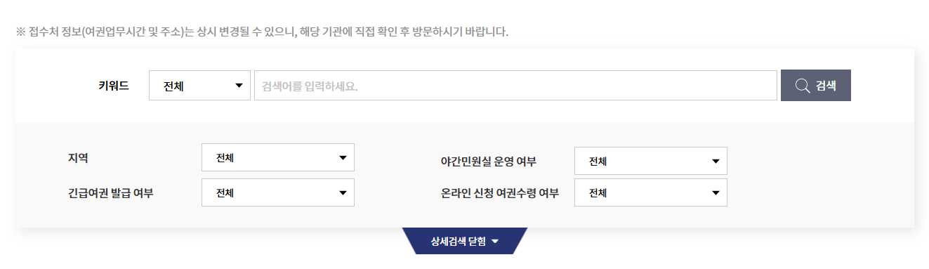 여권 발급 및 재발급을 위해 방문신청을 해야하는 경우 가까운 발급기관을 검색해볼 수가 있습니다. 또한, 온라인발급 신청 후에 여권을 수령하는 기관을 정할때도 이용을 하면 유용합니다.