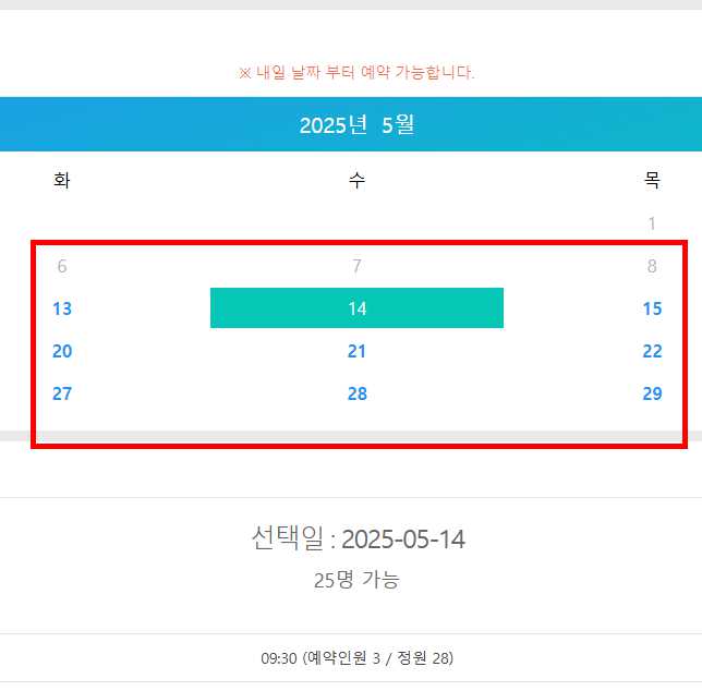 - 예약이 가능한 날짜가 표시가 되고 원하는 날짜로 선택하고 예약을 해주면 됩니다. 정원이 몇명이 남았는지도 확인이 가능합니다.
