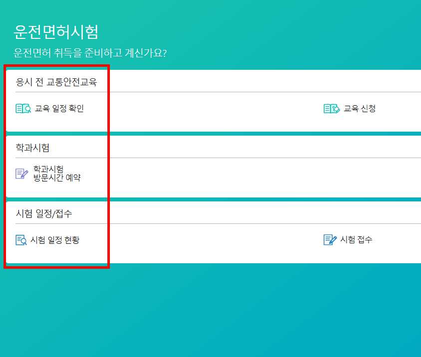 - 교육, 면허시험, 발급 등 항목에서 예약을 원하는 항목을 선택해줍니다.