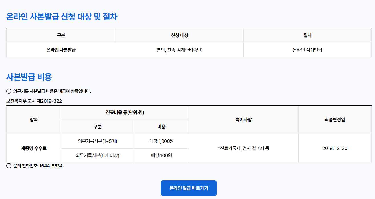 의무기록 사본 발급 비용은 보건복지부 고시 기준으로 1~5매는 장당 1,000원이며 6매 이상부터는 장당 100원입니다.