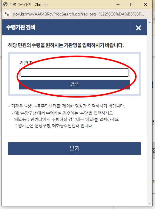 기관명에 내가 사는 동을 입력하면 가까운 주민센터가 검색되니, 선택을 하시면 됩니다.