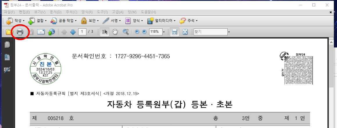 1) 조회를 했다면 자동차등록증 문서를 열어 우측에 인쇄버튼을 누릅니다.