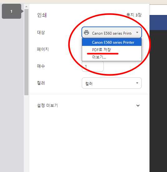 2) 프린터와 PDF로 저장을 할 수가 있는데, PDF로 저장을 추천드립니다. PDF로 저장을 해놓으면 언제든지 프린터로 출력을 할 수 있으니, 나중에도 파일을 열어서 출력만 하시면 됩니다.