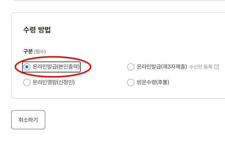3) 수령방법을 온라인발급 본인출력을 선택하고 신청하기를 누릅니다.