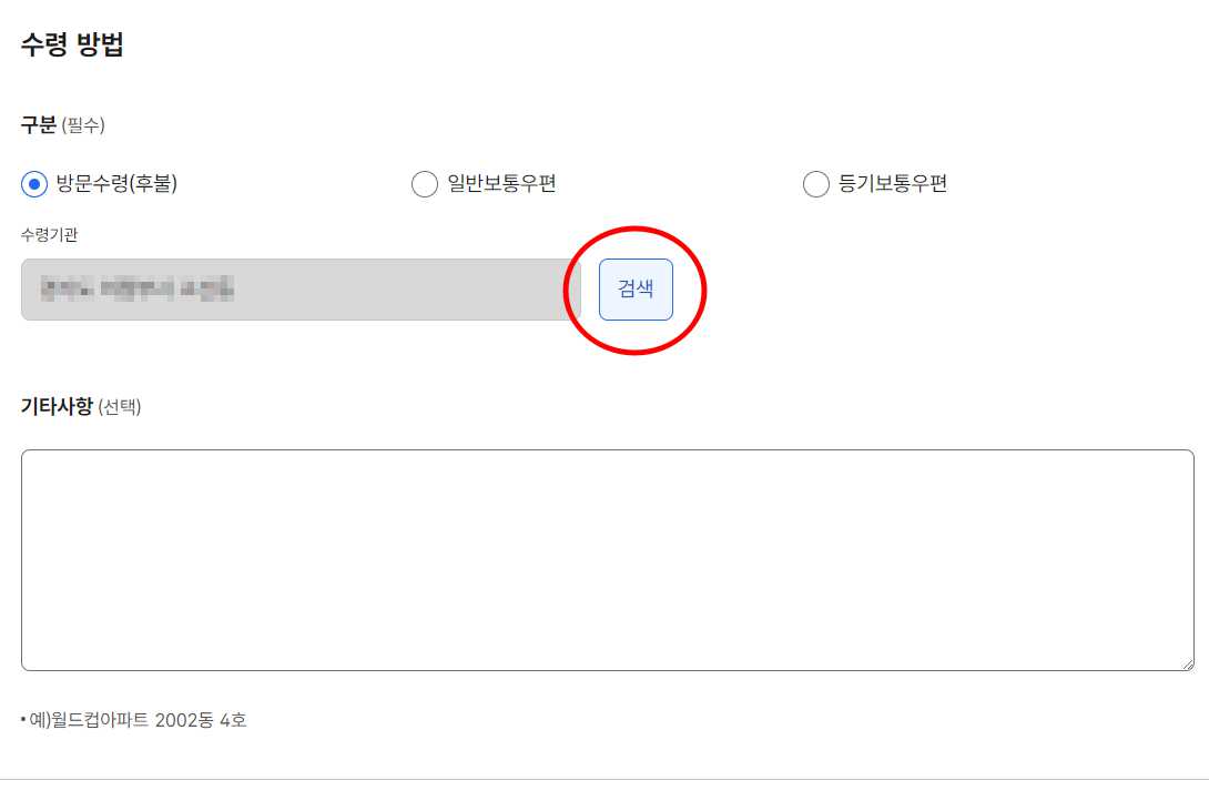 우편으로 받는 방법이나 방문수령 후불을 선택합니다.