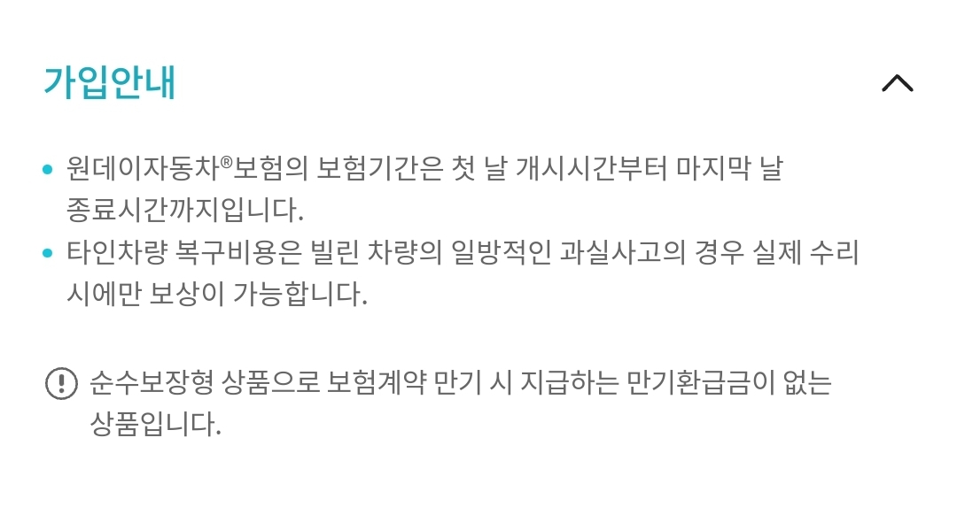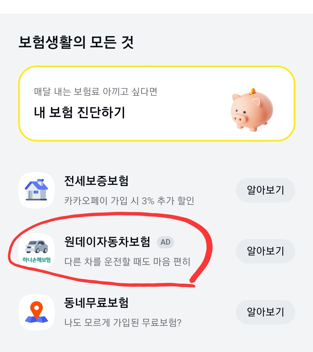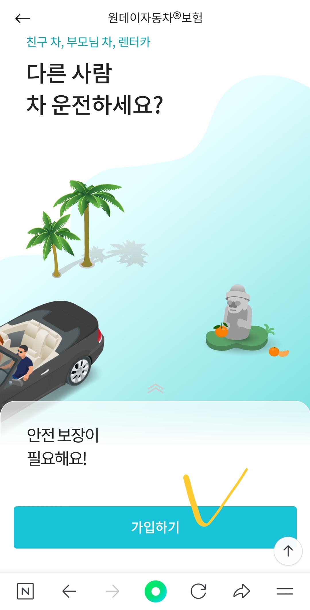 4) 들어가서 다시 스크롤을 내리면 '원데이자동차보험'을 눌러줍니다.