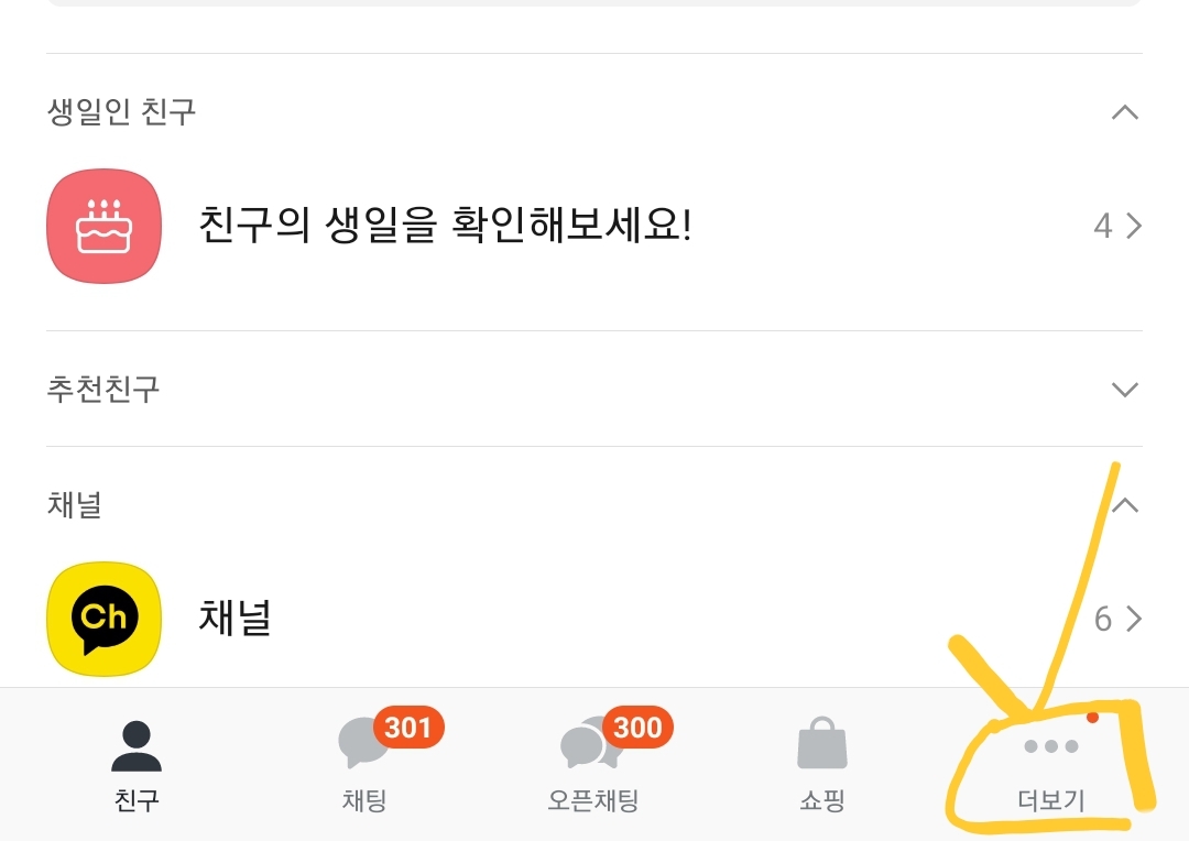 1) 카카오톡에 들어가서 우측 하단에 점3개 더보기를 눌러줍니다.
