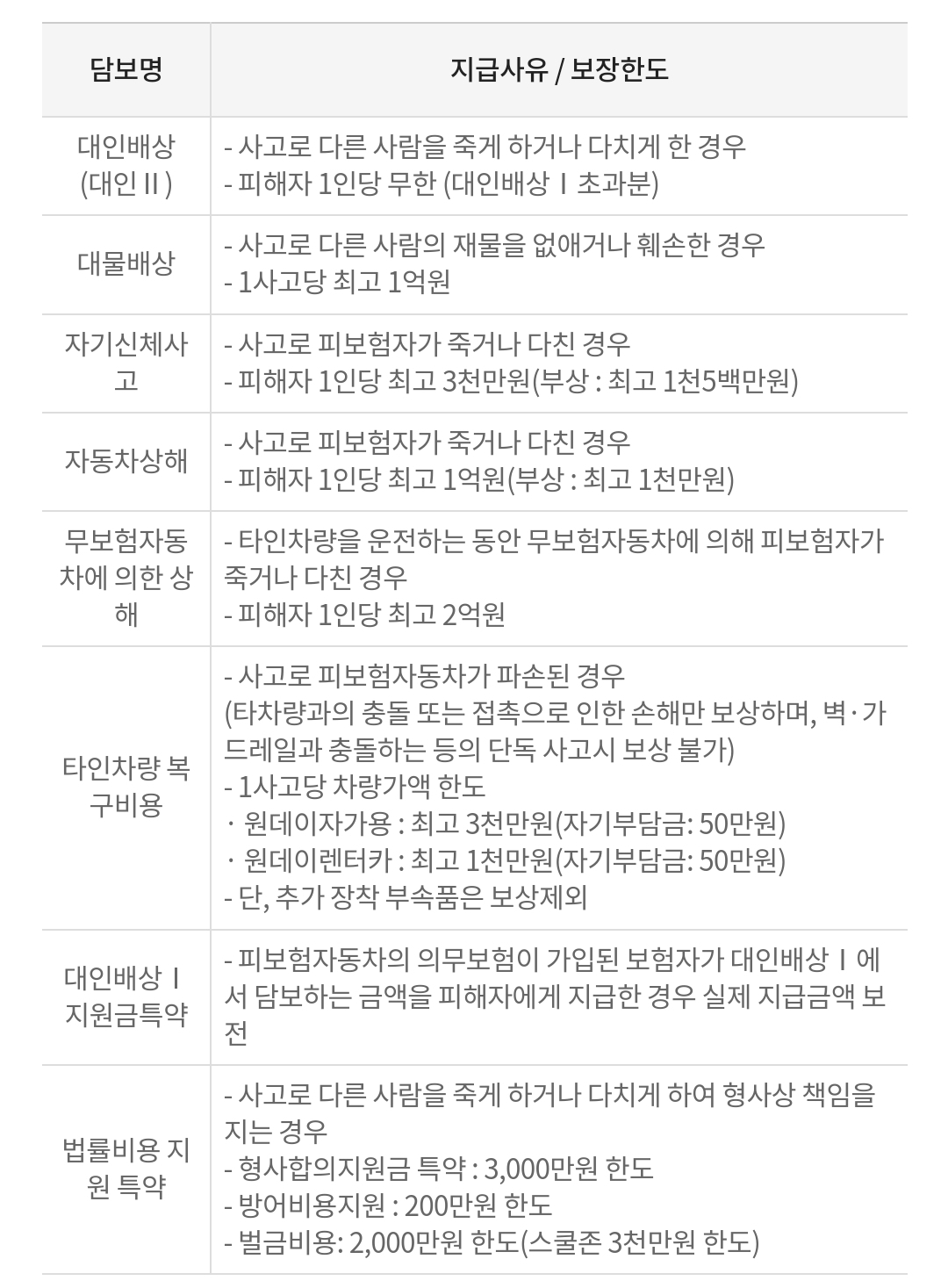 그리고 상대방의 차량이나 재산에 피해를 입힌 경우에도 보상이 되고, 운전자 본인이 사고로 부상을 입거나 사망할 경우 보상을 받을 수 있습니다. 사고 시 운전자 보호를 위해 중요한 보장입니다.