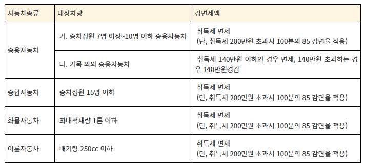 그리고 그외의 승용차는 취득세가 140만원 이하인 경우에는 면제이고, 초과하는 경우에는 140만원을 경감을 시켜줍니다. 15인승이하 승합차, 적재량1톤이하화물차, 250cc이하오토바이는 취득세 면제입니다.