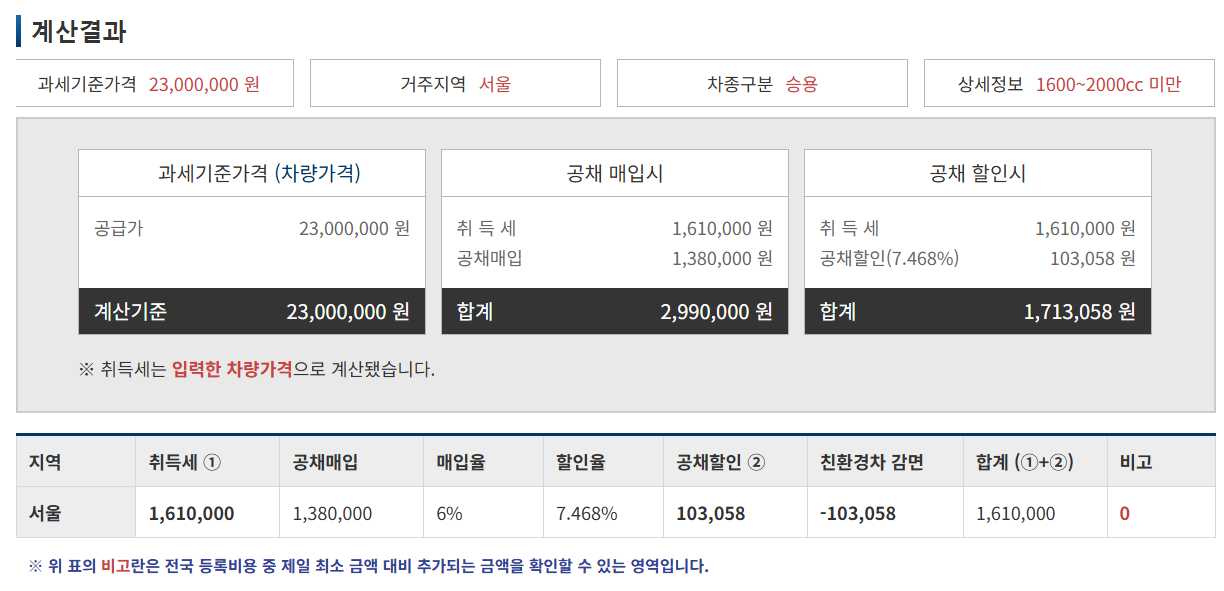 4) 그러면 바로 할인이나 감면 등을 통해 취등록세가 자동계산이 된 금액을 확인할 수 있습니다.