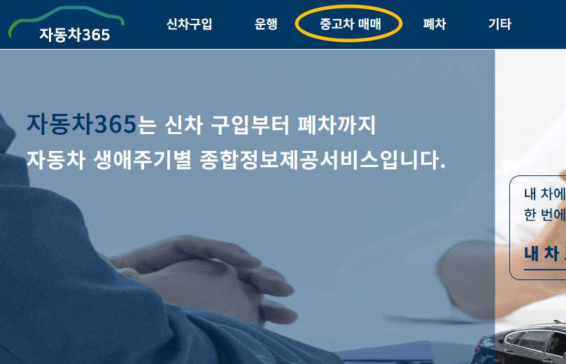 1) 상단메뉴에서 중고차매매를 메뉴를 클릭합니다.
