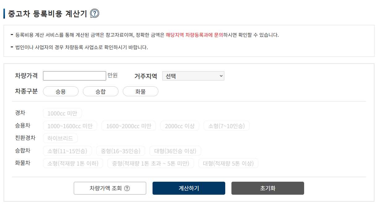 3) 차량가격과 지역, 차종, 배기량 등 정보를 입력하고 계산하기 버튼을 누릅니다.