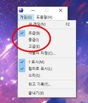 3) 상단메뉴 '게임'에서 초급, 중급, 고급 모드를 선택해 플레이 하시면 됩니다.